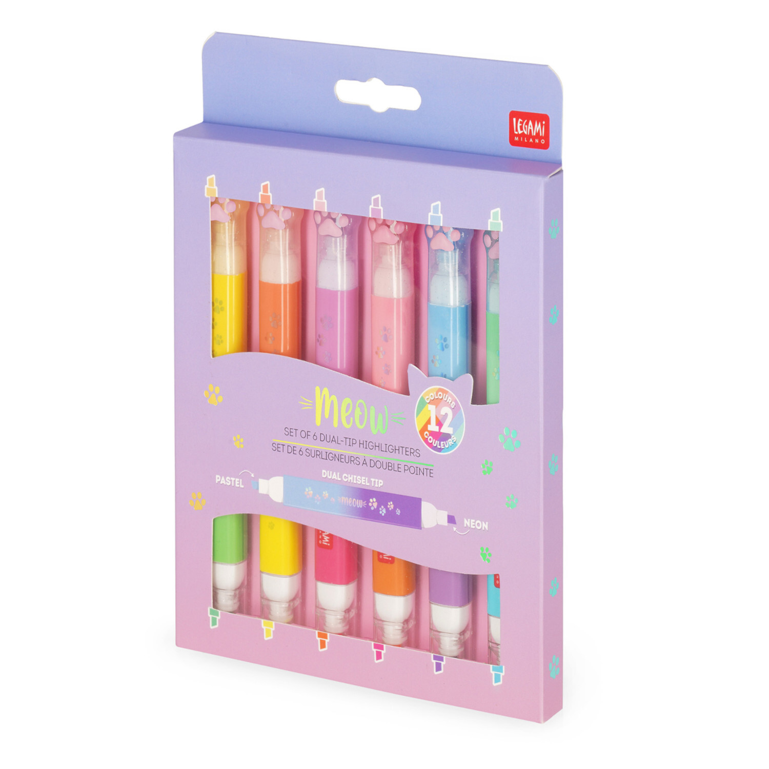 Das Set Highlighter Meow kombiniert sechs Textmarker im Kätzchen-Design mit praktischer Doppelspitze und bietet dadurch insgesamt zwölf Pastell- und Neonfarben. Die wasserbasierte Tinte eignet sich ideal zum Hervorheben wichtiger Informationen und sorgt für farbenfrohe Akzente in Notizen, Büchern und Unterlagen. Durch die doppelte Keilspitze entstehen markante Linien mit klarer Farbwirkung. Das handliche Format erleichtert die Nutzung im Alltag und macht die Marker zu einem verspielten, gleichzeitig funktionalen Schreibaccessoire.