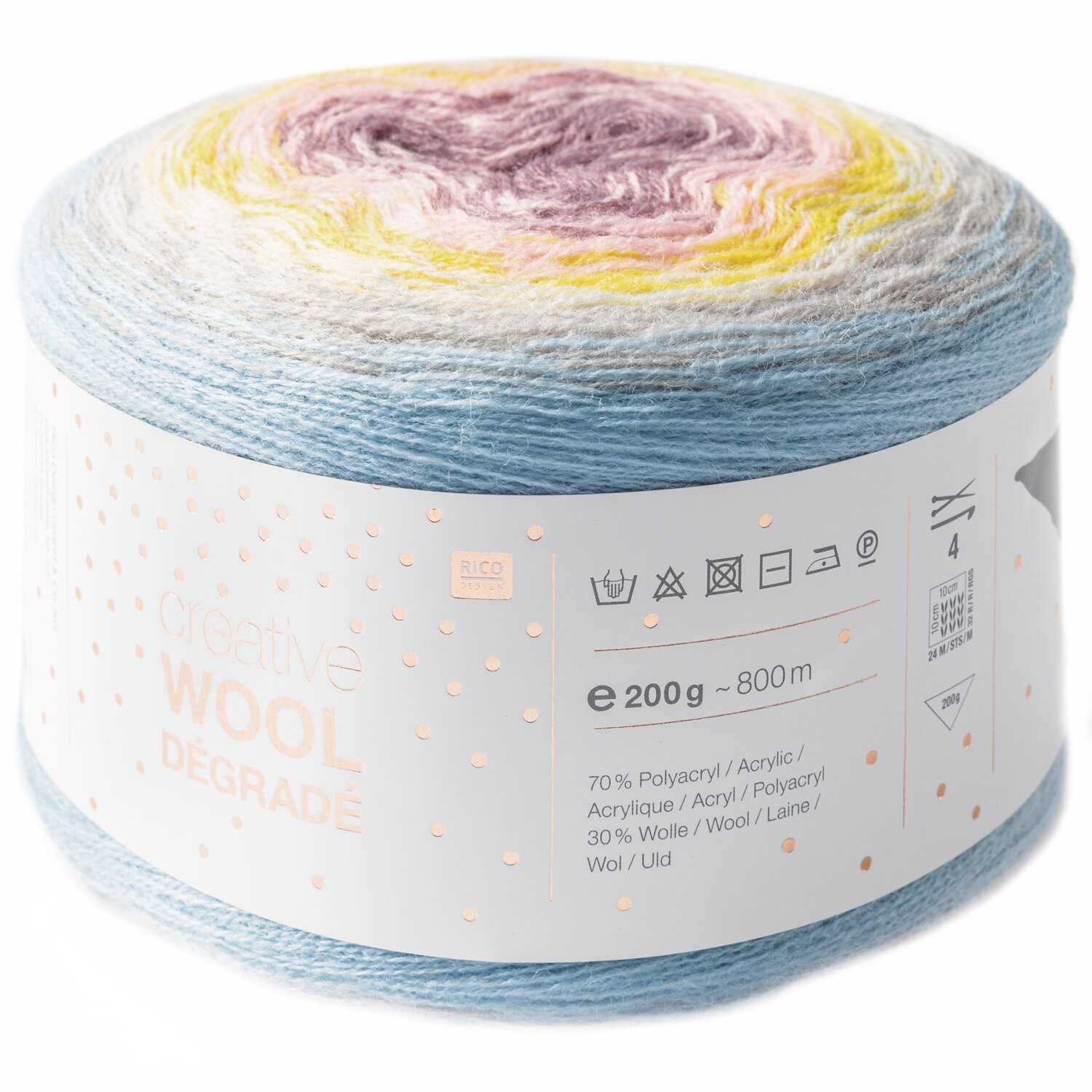 Creative Wool Dégradé Super6 vereint sechs verschiedene Farbtöne in einem einzigen Knäuel. Mit ihren harmonischen Übergängen ergeben die Farben eindrucksvolle Strickbilder. Die Garnqualität eignet sich daher hervorragend für Ponchos, Tücher, Kissen und vieles mehr.
