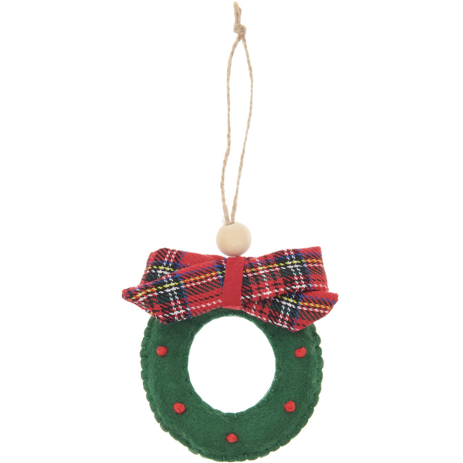 Dieser niedliche Filzkranz-Anhänger in Grün eignet sich perfekt als Verzierung für ein Geschenk oder zur Dekoration des Christbaums. Aufgestickt sind kleine roten Details und verziert ist dieser mit einer karierten Schleife am Befestigungsband.