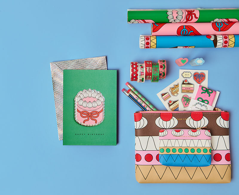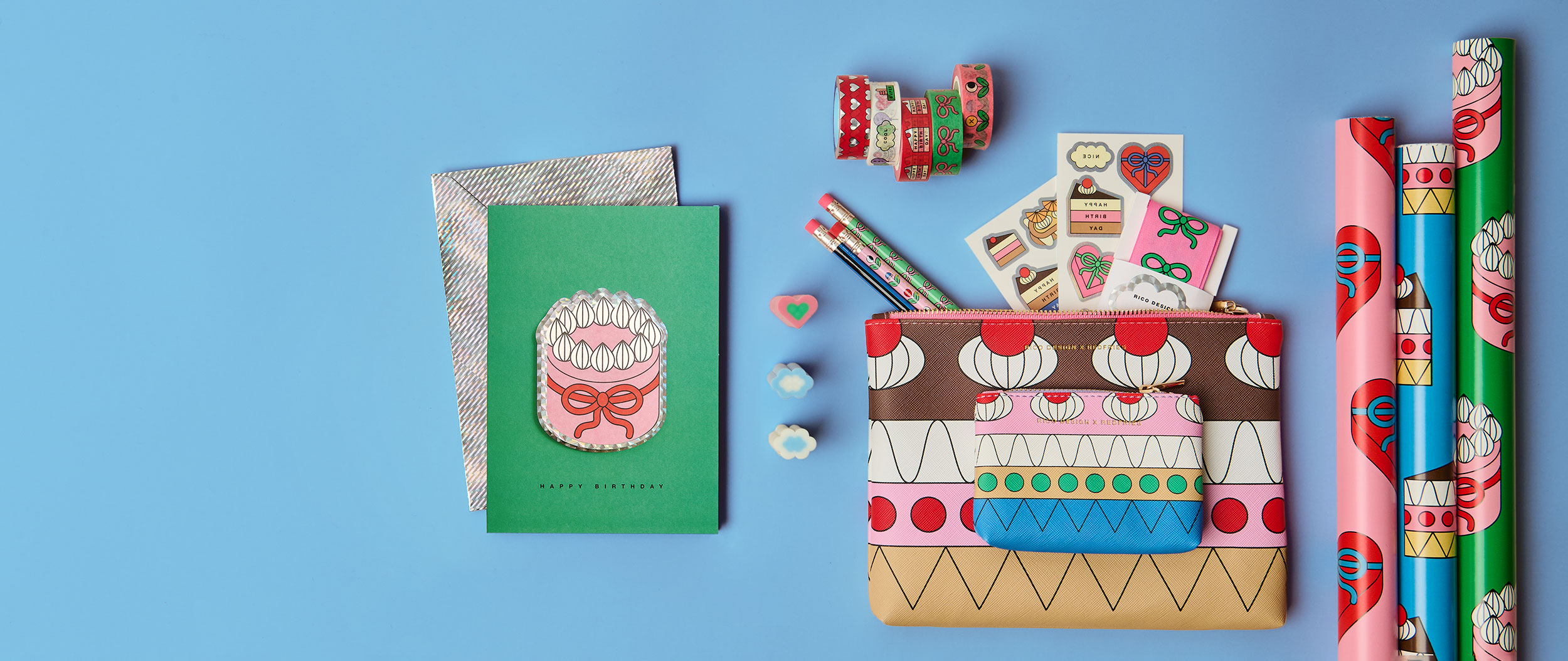 Drei Geschenkpapierrollen, eine Geschenkkarte und zwei Etuis mit Stickern, Bleistiften und Radiergummis. Flatlay von Produkten der Kollektion Eye Candy.